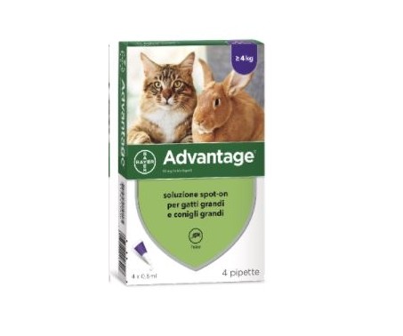 Advantage 4 Pipette 0,8ml Spot-On è un efficace antiparassitario utile per la prevenzione e il trattamento delle pulci per gatti di peso pari o superiore a 4 kg. Il prodotto contiene imidacloprid, che costituisce il principio attivo.
